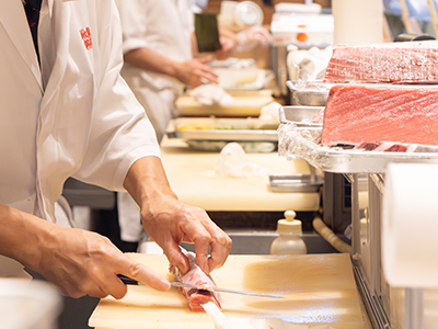 日々の調理はもちろん、季節の食材を使った新メニューの考案にも携われます。料理に対する情熱とアイデアを形にしてお客様にご提供するのが役割です。和食・洋食・中華の調理はもちろんのこと、今日まで積み上げた歴史ある寿司やうなぎの調理まで幅広い調理技術を習得することができます。