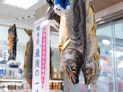 鮭にもこだわる吉池には鮭専門の売場もあります。鮭売場では北海道別海町の自社水産加工場から直送される手作りの塩鮭・干物・漬け魚等を販売しています。加工場の近海で水揚げされた新鮮な魚介類を使用しているので味が良いと評判です。それらの商品の仕入れ・製造計画も行います。