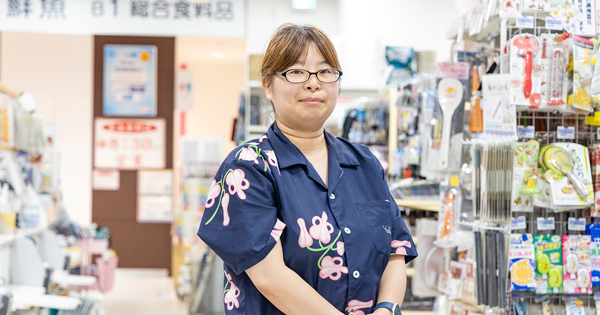 地下二階の雑貨売場で、洗剤や調理器具などの日用品の仕入れ・販売を担当しています。朝は納品された商品を並べたり、定番商品の発注をしたり。午後は追加納品や問屋さんへの発注、レジ応援に入ることもあります。配属されてからずっと雑貨売り場で仕事をしてきましたが、今では後輩に教える立場にもなりました。一般のお客様だけでなく近隣の店舗さんにも利用いただいており、「ここならなんでもそろうね」と言っていただける売場づくりを心がけています。