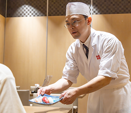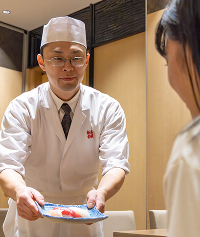 - もちろん、入社してすぐから寿司を握ったわけではありません。最初の1~2年は、いくつかの店舗でホール接客を経験することから始まりました。お客様とのやり取りや雑務を通じて、寿司職人に欠かせないコミュニケーションを学べたことは、今でも大きな財産です。